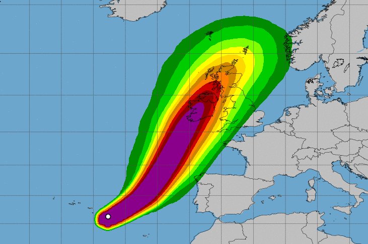 Ураган "Офелия", который прибыл с Атлантического океана, нанесет первый удар по территории Ирландии. Там уже власти объявили "красный" уровень тревоги, обозначающий опасность для имущества и жизни граждан. Далее ураган может двинуться на Великобританию.